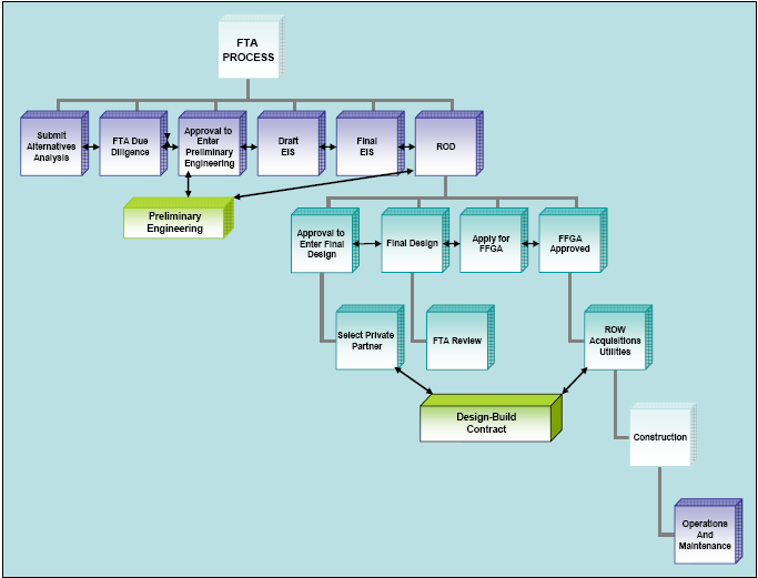 Exhibit 4.4 illustrates how the New Starts process could be adjusted to accommodate PPPs using a design-build project delivery approach. As shown in the exhibit, preliminary engineering is allowed to begin during preparation of the environmental clearance documents, with hiring of the design-build contractor to begin the final design following receipt of the ROD for the project from FTA.
