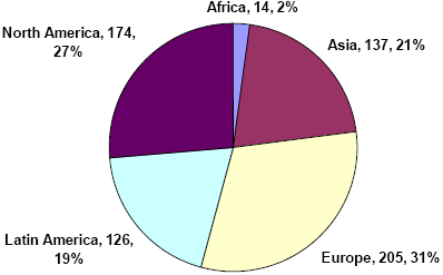 When focusing on highway-related infrastructure projects, including roads, bridges, and tunnels, the PWF database contains 656 projects worldwide, representing $325 billion since 1985, of which half have been completed by October 2004, as listed in Exhibit 7 below. On a regional basis, the most projects since 1985 are in Europe, with 205 projects representing $139 billion in costs. The second largest region in terms of projects is North America (including the United States, Canada, and Mexico) with 174 projects and $71 billion in costs. The second largest region in terms of costs is Asia, amounting to $84 billion for 137 projects.