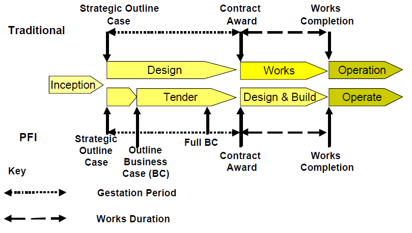 The initial estimates quoted were based on business cases developed at different project life-cycle stages: strategic outline case, outline business case (BC) and full BC. The optimism bias levels for traditionally procured projects tended to be measured from either the strategic outline BC or the outline BC and also at contract award. Private Finance Initiative (PFI) projects tended to be based on the full BC as the outline BC was not available. A representation of the project life-cycle is given below.