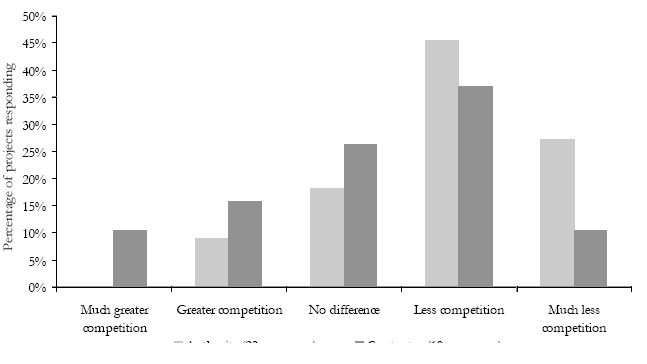 When considering the current situation, authorities and contractors alike said that they believed that the number of pre-qualification bids had fallen in recent years (see Figure 4 below). Authorities had some concerns that this meant that there was now limited competition and three respondents thought that competition was insufficient to obtain value for money. Contractors noted that the reduced number of bidders was partly due to the scale of recent projects, with smaller contractors unable to compete and the field reduced to the serious contenders.