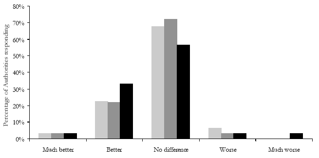 Figure 10 shows authorities' views on the relative performance of PPP projects. Most authorities did not perceive a difference in aesthetics, functionality or environmental performance between PPP and non-PPP projects, although some believed that PPPs perform better.