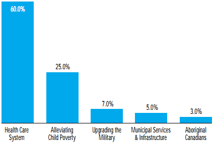 The 2002 Strategic Counsel survey went on to ask Canadians to choose only one policy area as their top priority for increased federal spending (Figure 9). When set against other competing priorities, "municipal services and infrastructure" clearly suffered. Only 5% of Canadians see that option as the first choice among the policy areas presented. Again, health care was the single most important policy priority, mentioned by 60% of survey respondents.