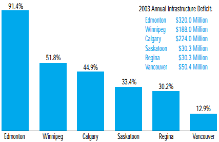■ Assessing the potential: The infrastructure deficits reported by the cities in 2003 are large relative to property tax collections, and they are growing. For example, unfunded projects in Calgary were $1.120 billion in the 2003-07 period ($224 million a year) compared to $1.375 billion ($275 million a year) in the 2004-08 period. Figure 10 expresses each city's annual infrastructure deficit for 2003 as a percent of the property taxes collected in 2002. If infrastructure deficits were to be closed with property taxes alone, tax revenue would have to double in Edmonton and increase by 50% in Winnipeg and Calgary. Saskatoon and Regina would have to increase property tax revenue by 30%. Even this may be insufficient since Regina's infrastructure deficit amount ignores certain services, and all needs might not have been measured in Saskatoon (Vander Ploeg 2003). Only in Vancouver does closing the gap with property taxes appear even remotely in reach. However, this may be illusory since the Greater Vancouver Regional District (GVRD) provides much of the capital intensive services for the city, and the size of any infrastructure deficit across the larger city-region remains unclear.