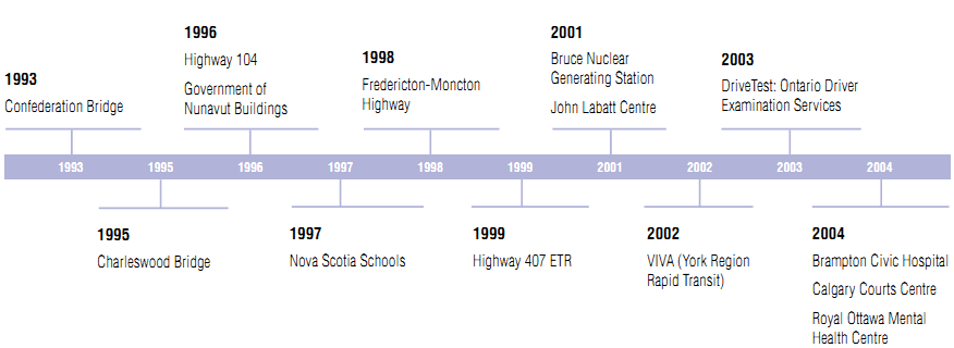 We excluded the first wave of Canadian P3 projects-such as Confederation Bridge, Highway 407 ETR, and the Brampton Civic Hospital-for several reasons. First, many of the P3 procurements chosen in the first wave were initiated at least in part by governments seeking to achieve off-balance-sheet accounting treatment for their infrastructure investments (e.g., Confederation Bridge, Highway 104 Western Alignment), although these accounting treatments have been largely discredited and are now no longer feasible.