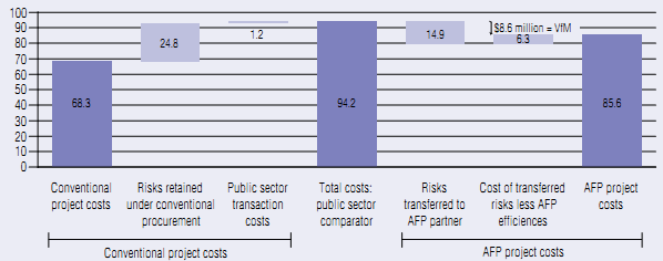 The Quinte Health care project-A Build-finance AFP project The Quinte Health Care (QHC) project had its roots in the amalgamation of the four Belleville-area hospitals proposed by the Health Services Restructuring Commission (HSRC). The capital project was approved for delivery as an alternative financing and procurement (AFP) project under the Ontario government's 2005-06 capital plan, which was part of the province's $30-billion infrastructure investment plan known as ReNew Ontario 2005-2010. The project involves adding a new wing to the Belleville General site (155,000 square feet) and renovating an additional 22,000 square feet. The total cost for this project under the AFP is $85.6 million, with the provincial government covering 90 per cent of the cost under the new hospital funding policy announced in June 2006. The risks transferred to the private sector contractor include: ♦ construction price certainty, based on a guaranteed maximum price of $72.2 million, including financing costs; ♦ project scheduling delays, based on QHC's payments to the contractor beginning at the point of substantial completion, which is expected in January 2010; ♦ design coordination risk, which refers to "the risk that change orders are required during construction due to design coordination/design completion/design gaps" that can be reasonably inferred.1 This risk was transferred even though the private partner was not responsible for the design of the facility, which was undertaken prior to the AFP project; ♦ financing risk; ♦ a schedule contingency, which shields QHC from the costs arising from up to 30 days of delays attributable to QHC; and ♦ commissioning and facility readiness. Some of the risks are shared between QHC and the contractor, including project scope changes by the owner and design errors and omissions. One key aspect of the project is the "change order protocol" agreed between Infrastructure Ontario and QHC.2 It sets out the principles governing any changes in project scope, including the "limited criteria under which change orders will be processed" and the conditions under which Infrastructure Ontario's approval is required.3 This protocol addresses an important source of cost overruns in conventional infrastructure projects. In addition, it provides a good example of an area where the project risks are mitigated by improved public sector management of the procurement process rather than being transferred to the private sector. The estimated VfM resulting from the AFP approach is $8.6 million or 9.2 per cent of the cost of the project using a conventional procurement approach. The chart summarizes how the VfM estimate is derived. Project costs under a conventional procurement approach consist of the conventional project costs (or the base project cost, which is the same under the AFP approach) of $68.3 million, the project risks retained by the public sector under a conventional procurement, which are valued at $24.8 million, and the transaction costs borne by the public sector ($1.2 million), for a total of $94.2 million. Under the AFP approach, 60 per cent of the risks retained by the public sector under a conventional procurement are transferred to the private contractor (i.e., $14.9 million). The cost of transferring these risks to the private contractor is $6.3 million. This sum is made up of the risk premium ($4 million) that the contractor requires for managing the additional risks and the incremental transaction costs incurred under the AFP approach ($2.3 million), which partly serve to carry out additional due diligence under the AFP approach. The result is an AFP project cost to the public sector of $85.6 million, which represents a savings of $8.6 million relative to the cost of the traditional approach. (Note that the difference between the $85.6 million figure and the $72.2 million capital cost paid to the contractor is the value of the risks retained by the private sector, $9.9 million, and the total transaction costs borne by the public sector, $3.5 million.4) As of December 10, 2009, the QHC project was 98-per-cent complete, with substantial completion scheduled for January 2010. The project has also been subject to contract variations and to claims against the public sector owner, but public sector spending has remained within the approved project budget of $85.6 million.