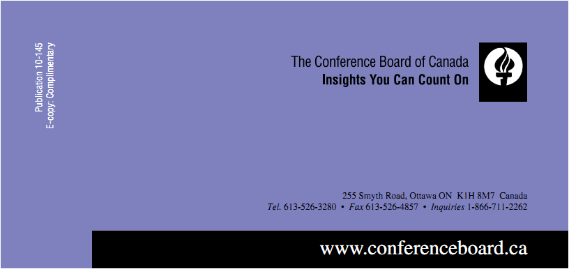 | The Conference Board of Canada 255 Smyth Road Ottawa ON K1H 8M7 Canada Tel. 1-866-711-2262 Fax 613-526-4857 | The Conference Board, Inc. 845 Third Avenue, New York NY 10022-6679 USA Tel. 212-759-0900 Fax 212-980-7014 | The Conference Board Europe Chaussée de La Hulpe 130, Box 11 B-1000 Brussels, Belgium Tel. +32 2 675 54 05 Fax +32 2 675 03 95 | The Conference Board Asia-Pacific 2802 Admiralty Centre, Tower 1 18 Harcourt Road, Admiralty Hong Kong SAR Tel. +852 2511 1630 Fax +852 2869 1403 |