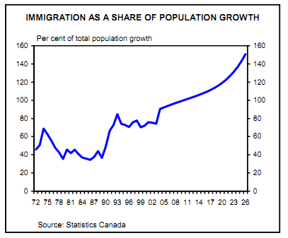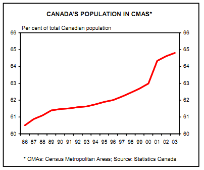 Apart from brief periods of recession in the early 1980s and early 1990s, the Canadian economy has grown steadily, placing added strain on the nation's infrastructure. And, this has been no more apparent than in Canada's largest cities, which have accounted for the bulk of the gains in economic activity and population. In fact, between 1971 and 2001, the share of the total population residing in Canada's census metropolitan areas (CMAs) surged from 56 per cent to 63 per cent. What's more, this trend is unlikely to cool off in the years ahead. Notably, with the new immigrants likely to make up 100 per cent of Canada's population growth by the end of the next decade - and with almost 80 per cent of annual immigrants historically flocking to the three largest CMA's - urbanization is poised to continue apace.