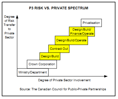 While most government activities are operated in public hands, partnering with the private sector is not a new concept in Canada - in fact, jurisdictions at all levels have increasingly turned to "contracting out" the delivery of public services to the private sector over the past decade. However, as the accompanying chart reveals, this form of P3 represents only one step along a continuum that extends from commissioning a private-sector group to design and build infrastructure to one whereby the project is designed, built, financed and operated (DBFO). And, in our view, it is in the upper part of the spectrum - and notably the DBFO approach - where Canadian governments have only begun to scratch the surface in exploiting infrastructure opportunities.