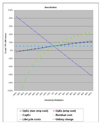 1.33 The two graphs (see example in Chart 1.A) on the Output sheet plot how far changes in each Conventional Procurement input variable impact on the VfM. Where an input line crosses 0, the user would be indifferent between the conventional procurement and PFI. It makes the crude assumption that changes to input variables apply only to one of the procurement methods (PFI for the Unitary Charge curve, and conventional procurement for all other curves represented in the graphs), but not to both at the same time. So, for example, an increase in Capital Expenditure tested through Indifference Point analysis is assumed to occur only to the option that, unadjusted, is demonstrating better VfM. The Spreadsheet implicitly assumes that such an increase is wholly avoided by the option which, unadjusted, shows poorer VfM. The graphs should give the user a feel for how sensitive the Spreadsheet is to each variable and therefore which assumptions they may wish to focus on.