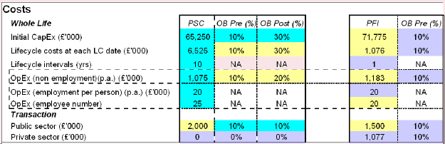 1.71 The Spreadsheet is set up in such a way that enables Procuring Authorities to test the proposition that PFI manages risks which typically emerge after the FBC stage more efficiently than is achieved through conventional procurement. This proposition relies on two testable factors. First, that more detailed (and more widely validated) project definition and development is completed at the FBC stage for the PFI Option. This is also reflected in the Spreadsheet through higher Transaction Costs for the PFI Option. Second, that, having reached contractual close, the PFI Option may deal more effectively, from the public sector's point of view, both with the risks that emerge and crystallise thereafter and, through contractual mechanisms that are more tightly calibrated with outputs, increases the probability that the benefits required from the project will be secured.