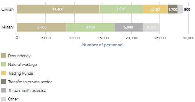 NOTES 1 As a result of the three month exercise the Army is expected to reduce by a further 5,000 personnel and the Department has yet to determine the detail of how it will achieve this reduction. 2 The "other" category for the military workforce includes the 2,000 personnel reduction the RAF committed to make before the Strategic Defence and Security Review and 1,000 which is a mix of rounding and adjustment of the Army baseline to 2011. 3 The "other" category in the civilian workforce includes the 900 reduction through natural wastage in the Department's wider civilian workforce for example Locally Engaged staff and Royal Navy Auxiliary. 4 Civilian numbers are based on Full Time Equivalents. 5 These figures were correct at the time of publication. Source: Figures provided by the Department |
