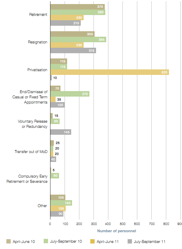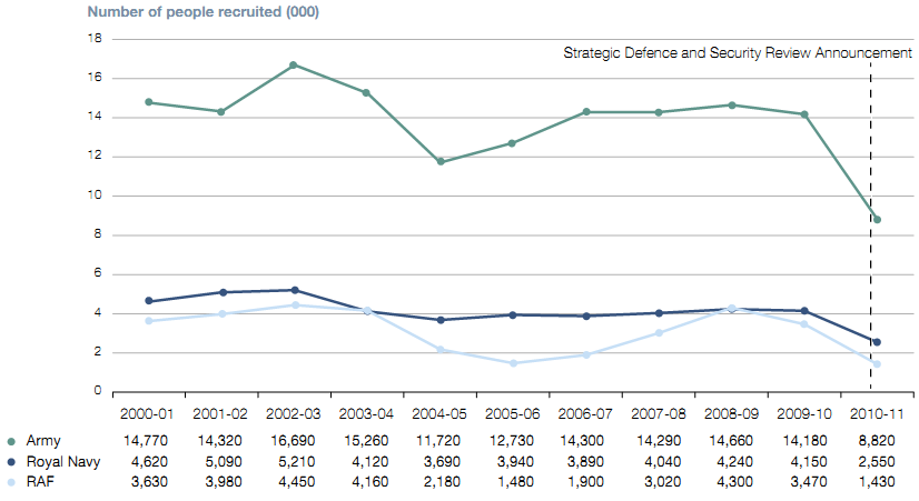 2.22 The Department aims to reduce military headcount by at least 8,400 through natural wastage and reduced recruitment by 2015 (Figure 3) which is 34 per cent of its overall target of 25,000 headcount reductions. The military have substantially reduced but not ceased recruitment. Stopping recruitment previously led to serious skills gaps in trades such as submariners from which the military is still recovering. The recruitment reduction is the biggest influence on declining personnel numbers before redundancy takes effect. As shown in Figure 6 on page 24, recruitment has nearly halved from 21,800 in 2009-10 to 12,800 in 2010-11. The numbers of trained personnel leaving the military have increased by 14 per cent from 12,280 in 2009-10 to 13,950 in 2010-11. The majority of people leaving in 2010 to 2011 left 'voluntarily' - before the end of their contract; or when their employment contract expired (time expiry).