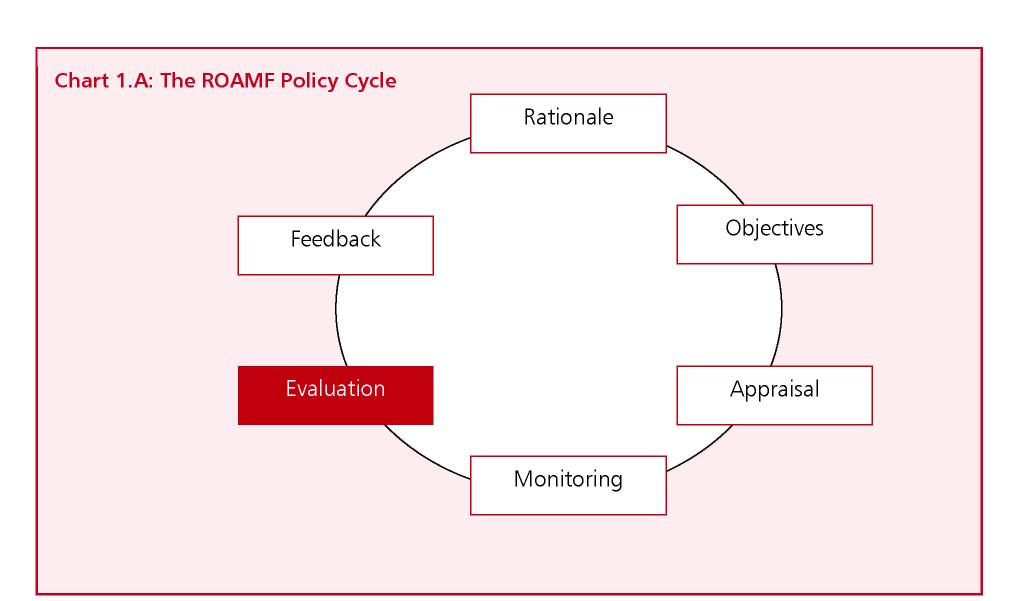 1.13 Evaluation is an integral part of a broad policy cycle that the Green Book formalises in the acronym ROAMEF. ROAMEF stands for Rationale, Objectives, Appraisal, Monitoring, Evaluation and Feedback. The ROAMEF cycle is presented in Chart 1.A. Though evaluation evidence can feed in throughout the whole policy cycle it is useful to highlight some of the key sections where evidence, including evaluation evidence can be used: