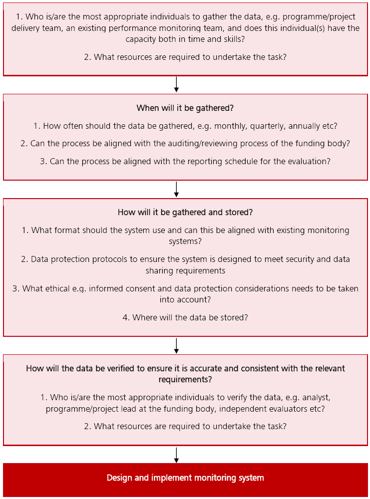 7.21 Box 7.C illustrates the key questions and considerations that need to be taken into account to design an effective monitoring system and subsequently to facilitate a good quality evaluation.
