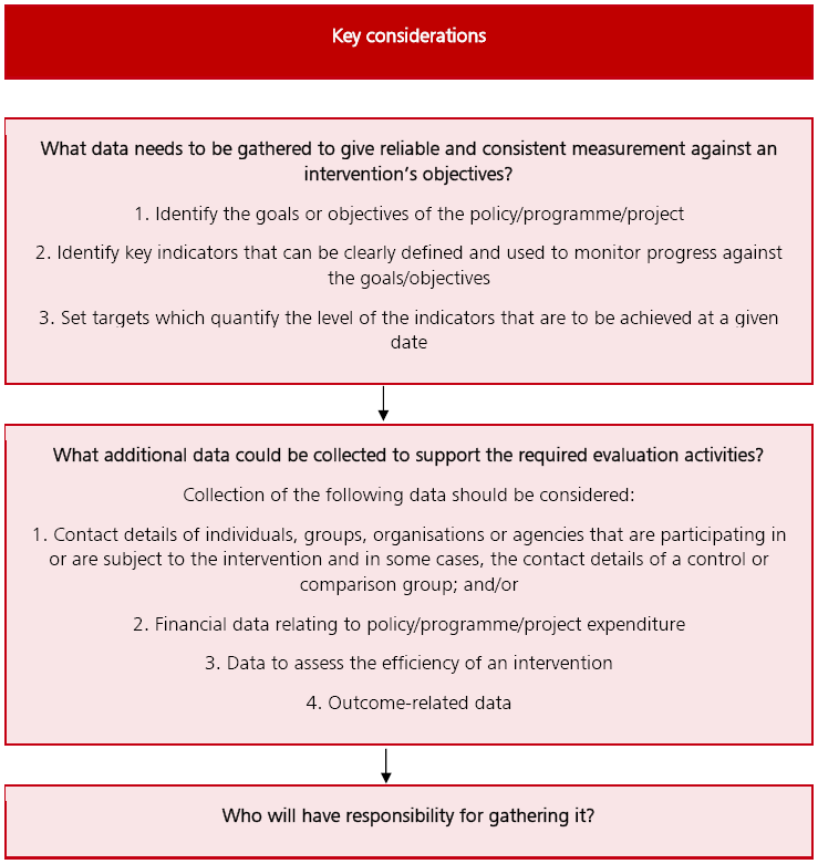 7.24 Frequently, however, new data, whether new monitoring data, or other forms of primary data, will need to be collected. This requires advance planning and ideally should be specified when designing a policy to ensure that the systems are in place to provide evaluators with the required data.