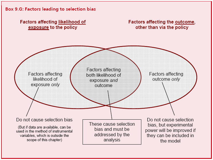 9.40 If the groups are thought to be non-equivalent, further steps must be taken to modify the model in a way that will allow any apparent policy effect to be attributed to the policy, just as it would be for a true experiment. This means overcoming selection bias as introduced in paragraph 9.14. More specifically, selection bias arises when there are factors (Box 9.G) affecting both: