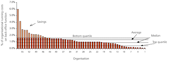 1.9 Chart 1.B illustrates the benchmarking methodology, using a sample of CIPFA data for around 50-607 public sector organisations. Some organisations will, of course, have particular requirements of their back office functions but the scale of the differences underlines the potential for cost savings. The public sector would only have to move the weakest performing organisations up to the top end of the lowest performance quartile to generate savings of around £4 billion per year.