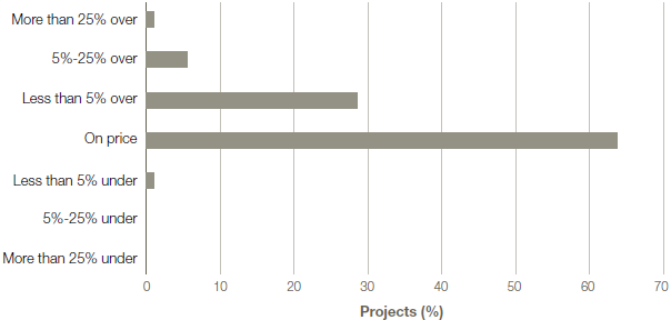 41 Ninety four per cent of projects responding to our 2008 survey were reported to have been delivered on, or less than five per cent over, price. The remaining six per cent reported price increases of five per cent and over. One project reported delivery at less than the contracted price, which was because of public sector initiated changes which reduced the price (Figure 8).