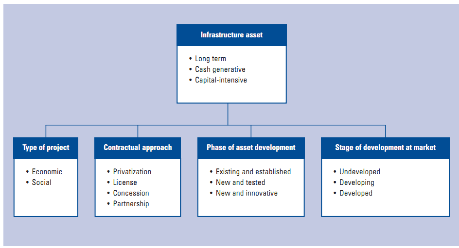 Overall, the definition of an individual infrastructure opportunity needs to draw on all four components in order to give a meaningful description. For example, a partnership for a new social infrastructure project in a developed market is very different from the privatization of an established economic project in an undeveloped market. These differences will attract or deter different sources of private finance.