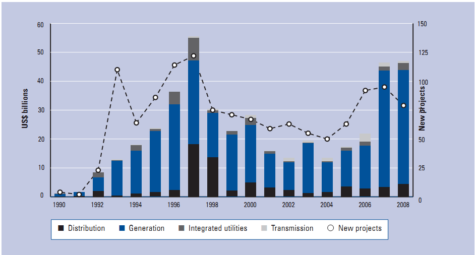 Figure 3: Investment commitments to electricity projects with private participation in developing countries, by segment (1990-2008)