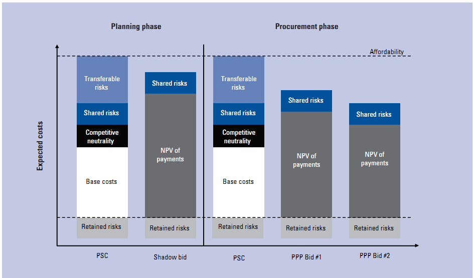 Note: PSC is the "Public Sector Comparator" or the public sector cost of delivering a proposed contract . The shadow bid is an estimate of what PPP bids will be.