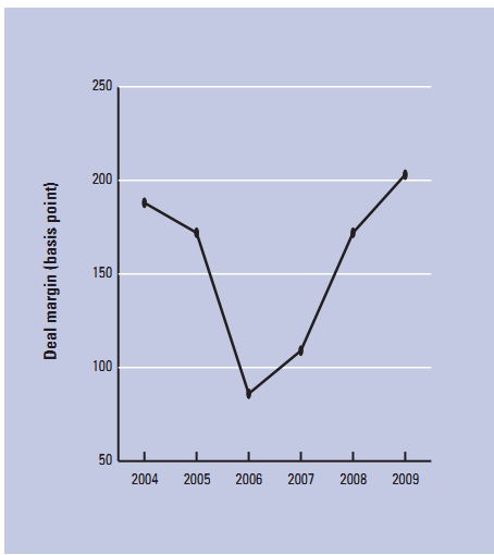 For example, globally, deal margins in the PPP sector have more than doubled in the period 2006 to 2009 (see Figure 4). The reduction in loan term has not been entirely consistent across the banking community, but a survey of 20 of the leading banks in the UK PPP market completed in early 2009 reported "a consistent desire for a shortening of loan maturities."2