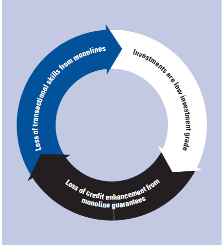 Much of the infrastructure bond market, particular for the PPP and concessions sectors is of low investment grade. This is steadily exacerbated as credit enhancement through monolines has fallen away together with the transactional skills those monolines bring to the market. This "vicious circle" is illustrated in Figure 7.