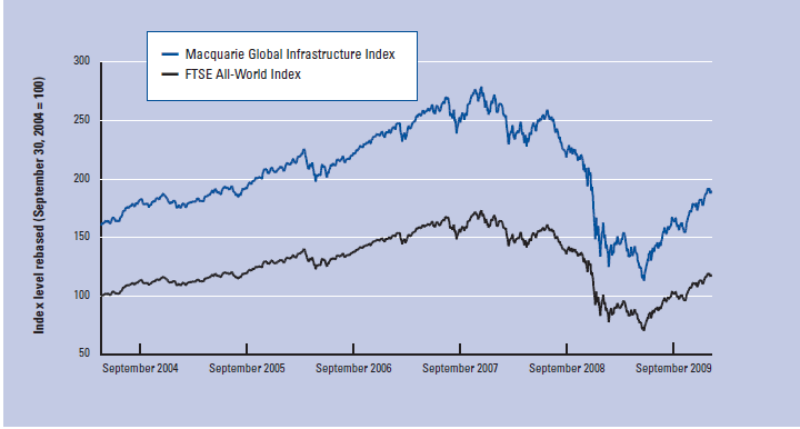 Figure 5: A Comparison of Macquarie's Global Infrastructure Index and the FTSE All-World Index, September 2004 to September 2009