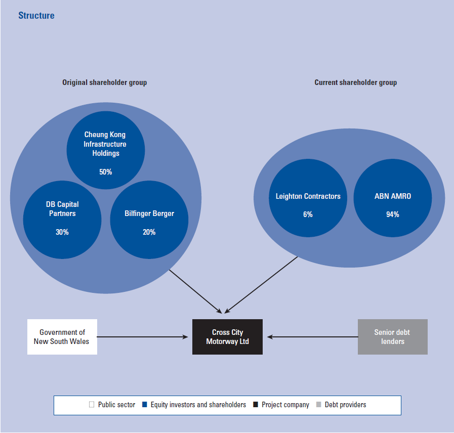 • The original concessionaire, Cross City Motorway Ltd, was a special-purpose company owned by Cheung Kong Infrastructure, the largest diversified infrastructure company in Hong Kong with a market cap of approximately HK$30 billion (2001); DB Capital Partners, one of the largest infrastructure fund managers in Australia; and Bilfinger Berger, one of Germany's largest civil engineering companies with operations globally.