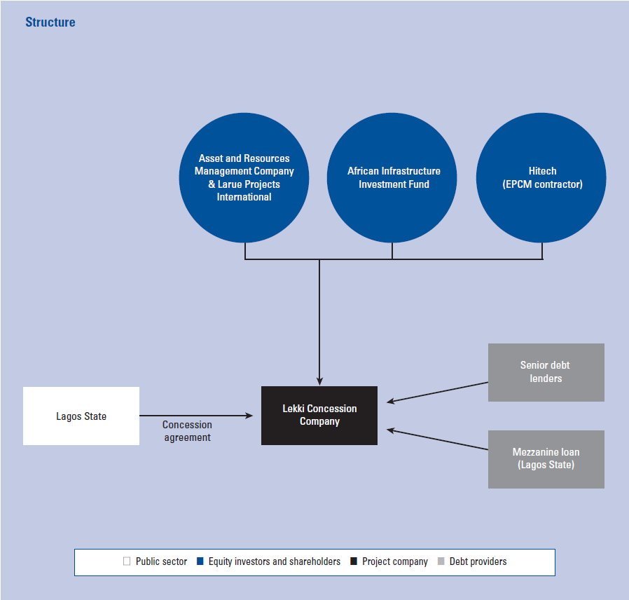• Lekki Concession Company (concessionaire): Party responsible for operations. Macquarie Bank of Australia and Old Mutual of South Africa (through the African Infrastructure Investment Fund, or AIIF) are major shareholders. Other shareholders include: