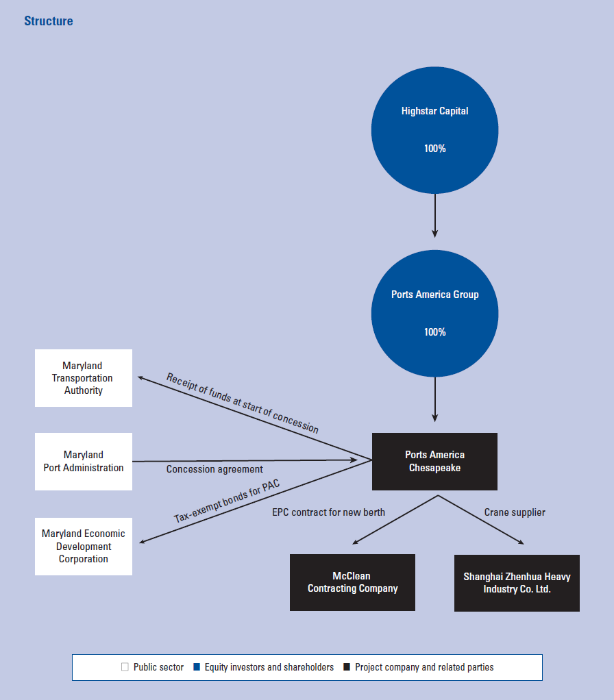 • The Maryland Economic Development Corporation (MEDCO), a body created by the State of Maryland to own or develop property for economic development. For this project MEDCO was the conduit to issue approximately US$249 million in revenue bonds on behalf of PAC. MEDCO also facilitated the purchase of the terminal by the MPA from the MdTA.