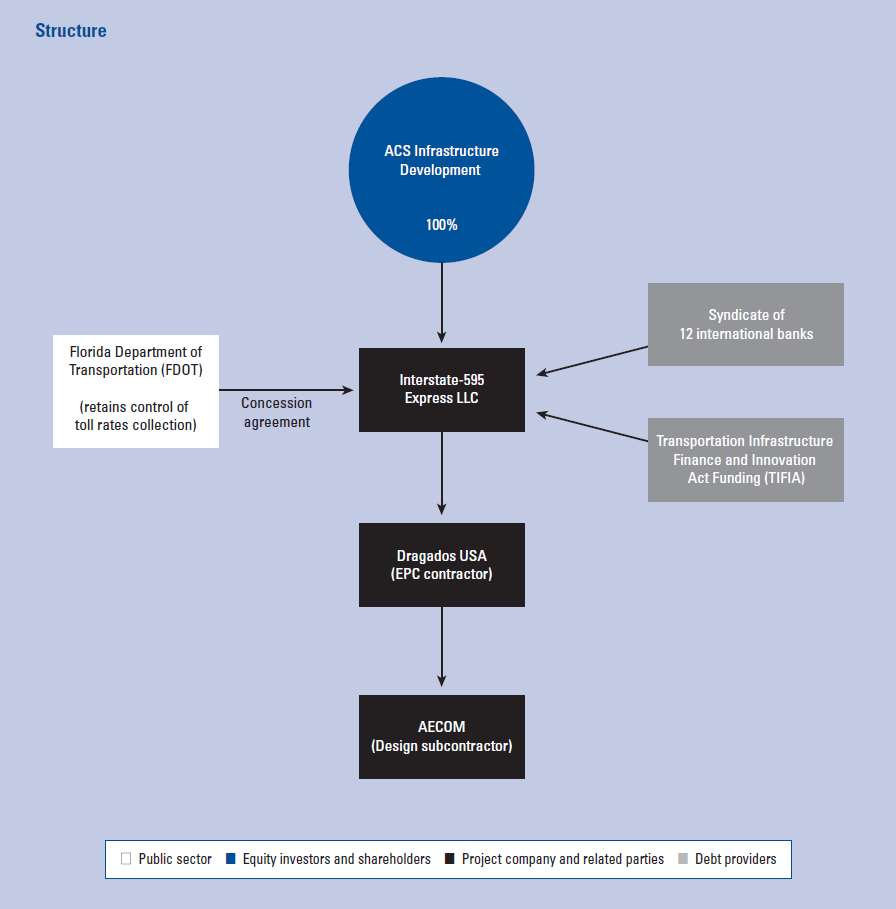 The financing structure for the project was a combination of commercial debt and a loan. Originally, it was anticipated that much of the funding would come through issues of private activity bonds (PABs). To encourage this, FDOT obtained approval from US DOT for a provisional allocation of US$2 billion. Nonetheless, private financing was all arranged in the senior debt bank market, with the balance provided by a TIFIA loan.