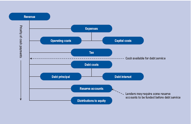 Figure 4 shows that, for infrastructure projects, a range of reserve accounts may often be required. These reserves may be for major maintenance of the asset or to deal with changes in law. The requirement for these reserves will come from the lenders and are an additional cost of private finance.