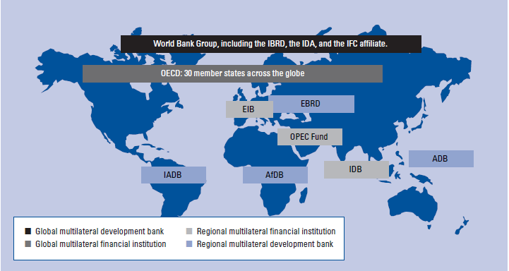 Note: ADB = Asian Development Bank; AfDB = African Development Bank; EBRD = European Bank for Reconstruction and Development; EIB = European Investment Bank; IADB = Inter-American Development Bank; IBRD = International Bank of Reconstruction and Development; IDA = International Development Association; IDB = Islamic Development Bank; IFC = International Finance Corporation (World Bank Group affiliate); and OECD = Organisation for Economic Cooperation and Development.