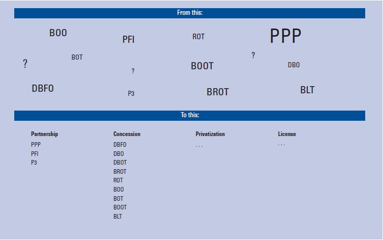 Although only one of many contractual approaches, PPPs seem to attract a disproportionate amount of attention. As with the broader infrastructure term, there has been much discourse about the PPP approach to fund infrastructure projects, but again there is no single definition. The term PPP is used by some to describe any project or opportunity where both the public and private sectors are parties to the transaction. But this then captures many economic and social infrastructure developments, and such usage ignores the "partnership" aspect of the arrangement. Other schools of thought consider PPPs to be linked to those circumstances where the private sector is providing infrastructure or infrastructure-related services that were traditionally provided by the government-that is, projects that are more focused on social infrastructure, or that involve the transfer of risk from the government to the private sector. Further, some concessions will also be classified as PPPs. Perhaps the PPP term is better used to describe the philosophy behind the approach, capturing such elements as partnerships, risk transfer, and social service, rather than the contractual approach itself.