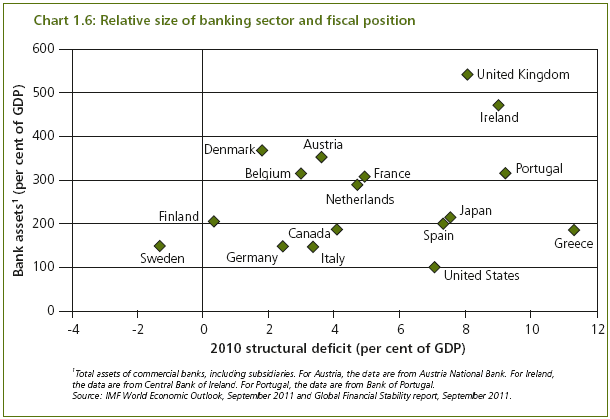 1.42 Fiscal consolidation also reduces the risk of negative feedback loops between weak public finances and a strained financial sector. These feedback loops can be very damaging, as evidenced by recent events in the euro area. The UK has a very large financial sector, both globally and relative to the size of its economy (see Chart 1.6), meaning any loss of investor confidence in the UK's fiscal position would not only affect the UK, but also the global economy. As the IMF have stated "the stability and efficiency of the UK financial system is a 'global public good' due to potential spillovers".11 It is the IMF's view that the UK's economic and financial sector policies have a systemic impact on the global economy.12, 13