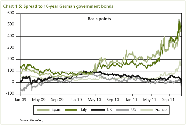• in May 2010 the spread of UK gilts to German bunds was around the same level as that of Italy and Spain. However, Spain now faces long-term interest rates above six per cent and Italy above seven per cent.