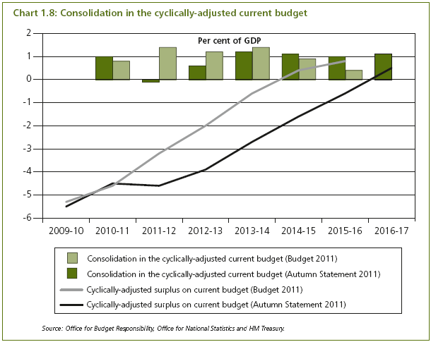 1.61 Charts 1.8 and 1.9 show performance against the Government's fiscal mandate and the supplementary debt target. Slower progress in reducing the cyclically adjusted current budget deficit in 2011-12 and 2012-13 reflects the OBR's downwards revision to trend growth, consistent with evidence suggesting that financial crises are typically associated with large output losses that persist for many years after that event.