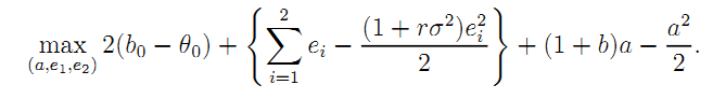 Denote by µ the multiplier of (A.12). Observe that the first-order conditions w.r.t. (e1, e2, a) can be written respectively as: