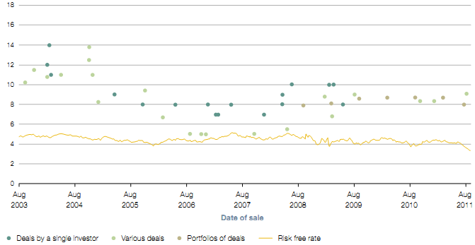 3.19 Figure 12 compares secondary market rates of return with the relatively risk-free rates available from UK government bonds. The annualised rates of return that secondary investors required fell from around 12 per cent in 2003 to just above 7 per cent in 2005. This fall reflected wider market changes, secondary market competition and growing investor understanding of PFI operating risks.