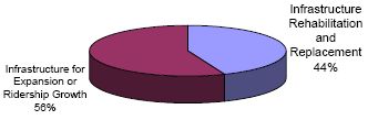 Of the $20.7 billion total needed for transit infrastructure, over $9.1 billion, or 44%, is needed to replace or rehabilitate existing infrastructure, while approximately $11.6 billion is for expansion, to respond to population growth or to attract new ridership (see Figure 1).