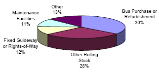 Figure 3 outlines the division of categories within rehabilitation or replacement needs. Approximately $3.2 billion will be needed simply to maintain fleets at their current sizes. More than $2.6 billion will be needed to maintain other rolling stock, such as subways, light rail and commuter rail equipment, and $1.1 billion will be needed to replace or rehabilitate existing fixed guideways or rights-of-way. Significant investments will also be needed to replace or refurbish maintenance facilities and other items including fare collection equipment, terminals and software to improve or implement intelligent transportation systems.
