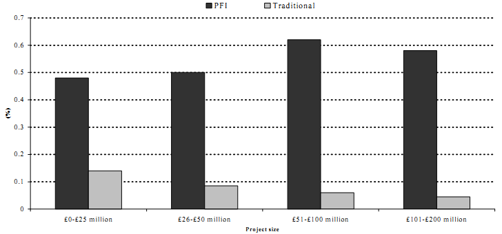 Private partners have often criticised the high cost of organising bids for PFI projects. It is argued that private sector contractors who tend for PFI project bids have to cover higher 'front-loaded' costs when drawing up detailed specifications and contract terms than when preparing bids for public services projects under conventionally tendered contracts. There is little hard evidence for the cost of the tendering process as it is usually considered confidential. The evidence that does exist appears to support the argument. A 1996 report from the Adam Smith Institute66 found average tender costs expressed as a percentage of expected total costs, across projects of all sizes, to be higher for PFI public services projects than for traditionally procured projects, as can be seen in the figure below:67