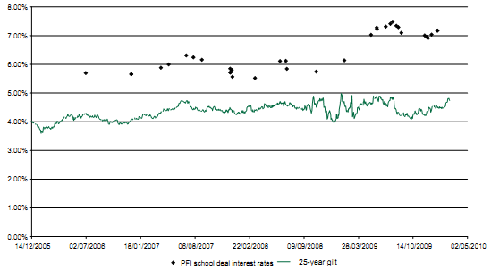 11. Some 35 privately financed contracts were let in 2009 during the height of the credit crisis. Higher financing costs increased the cost of a typical contract by 6 to 7 per cent compared to commitments entered into before the credit crisis.14 When benchmarked against the rates available from the financing markets just before the credit crisis, the higher bank changes on the 35 contracts were around £1 billion.15 The Treasury and departments saw these substantial cost increases as unavoidable, and the result of market pricing. Figure 1 shows the increased cost of loans for school building projects in 2009, compared to the Government's long term borrowing cost.