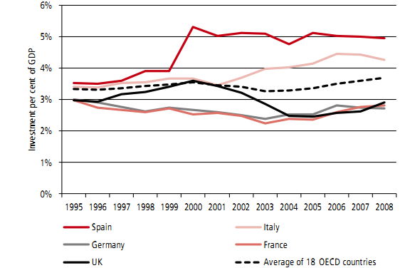 1.6 The UK has tended, over the last 15 years, to invest a similar or greater proportion of its GDP in economic infrastructure (around three per cent on average) as countries such as France and Germany, but since the turn of the century the rate of investment has fallen behind that of the rest of the OECD (see Chart 1.A):