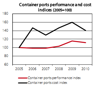3.32 Performance of the supply chain through UK container ports has improved since 2005, largely driven by improved service quality (reduced delivery times and improved connectivity). On the other hand, the cost of importing and exporting goods via container ports has increased, although this is partly as a result of other cost elements (e.g. inland transport, administrative fees, documents, but not taxes and tariffs) which do not relate to port infrastructure.