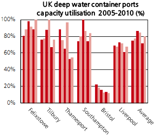 3.33 The recent recession freed up some spare capacity at deep water ports in 2009, but demand began to recover in 2010, with Felixstowe operating close to estimated capacity (see Chart 3.D). The on-going development of Felixstowe South should ease this situation.