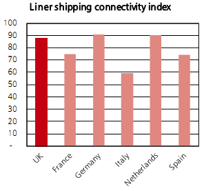 • The UK has some of the best connected ports in Europe, as measured by the liner shipping connectivity index; and