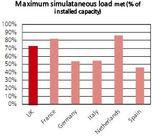 3.63 At the moment capacity margins in electricity generation are adequate relative to peak demand (to some extent, driven also by a fall in peak demand due to the recession). Chart 3.E below indicates that the UK has larger capacity margins compared to countries such as France and the Netherlands, but lower than Germany, Italy or Spain. A higher margin is not, however, in itself a sufficient indicator of security of supply: what is considered adequate in a country with a large proportion of intermittent supply such as Spain can be very different from what is needed in countries with largely reliable generation like France. The UK therefore needs to assess its own capacity needs based on its evolving generation mix over time.