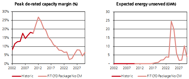 Source: Department of Energy and Climate Change, July (2011). The de-rated capacity margin is the capacity margin adjusted to take account of the availability of plant, specific to each technology. It reflects the probable proportion of a source of electricity that is likely to be technically available to generate. The chart above presents the results of modelling the electricity system in the absence of a capacity mechanism, but with increased low carbon generation induced by the support mechanisms presented in the White Paper on Electricity Market Reform. |
